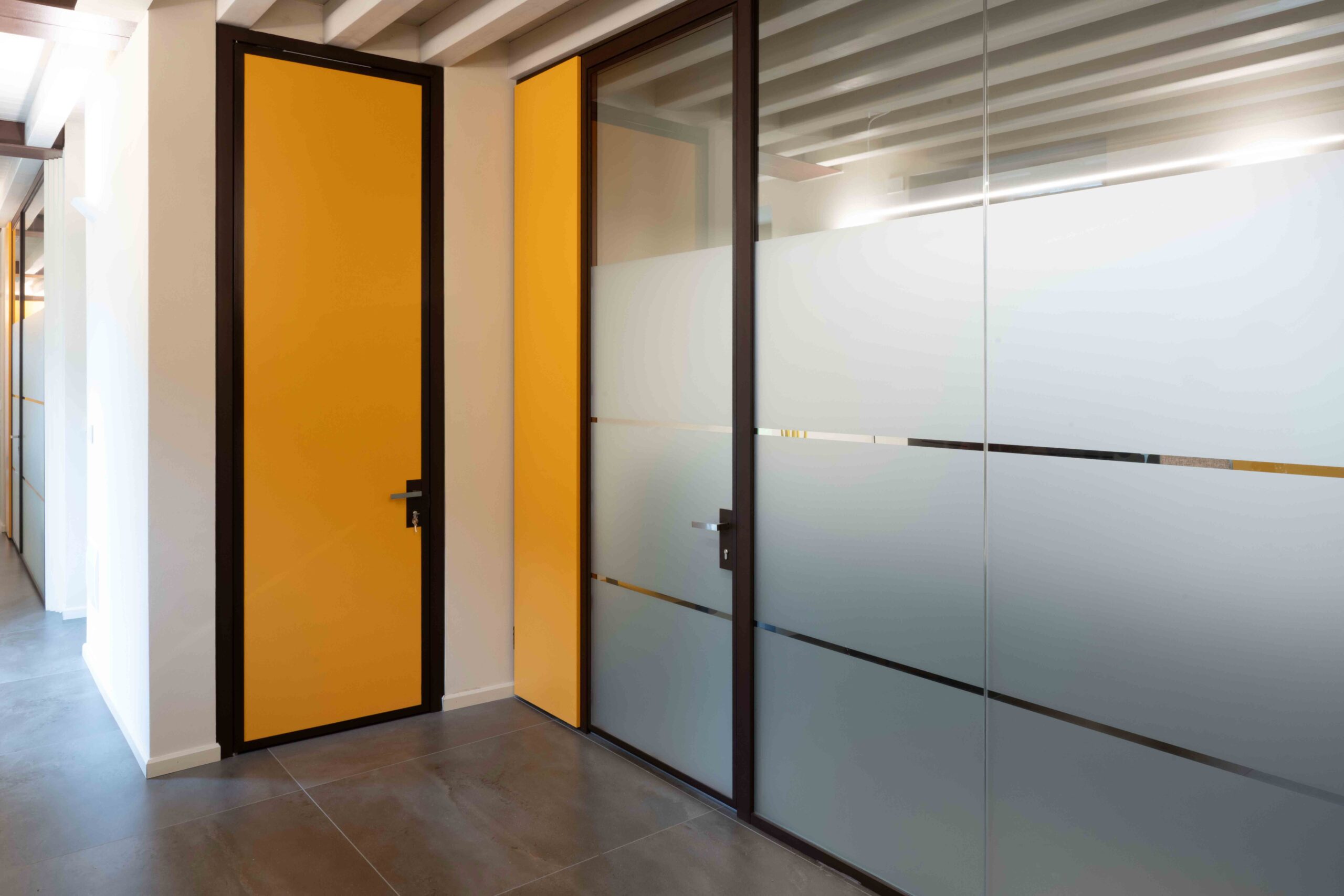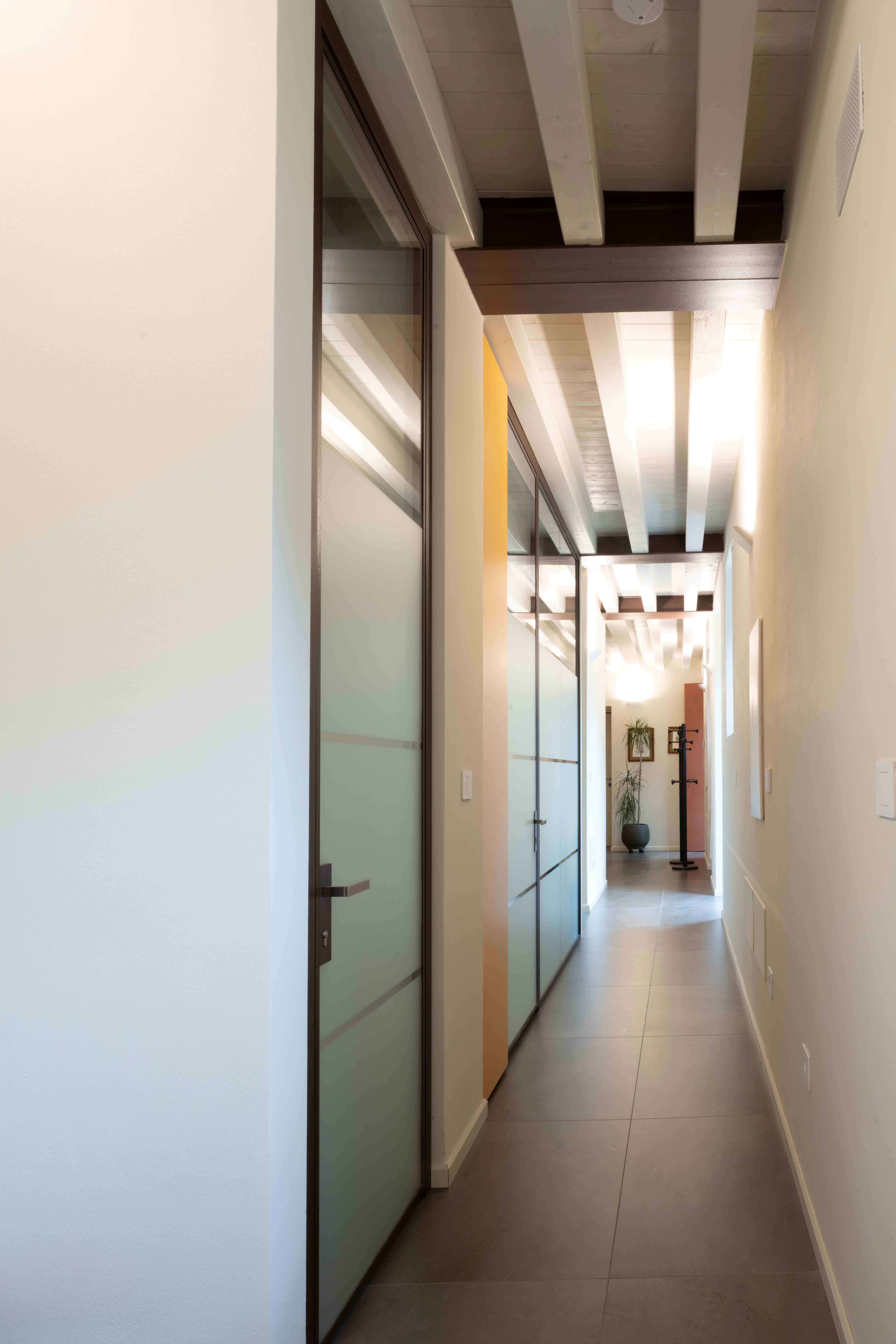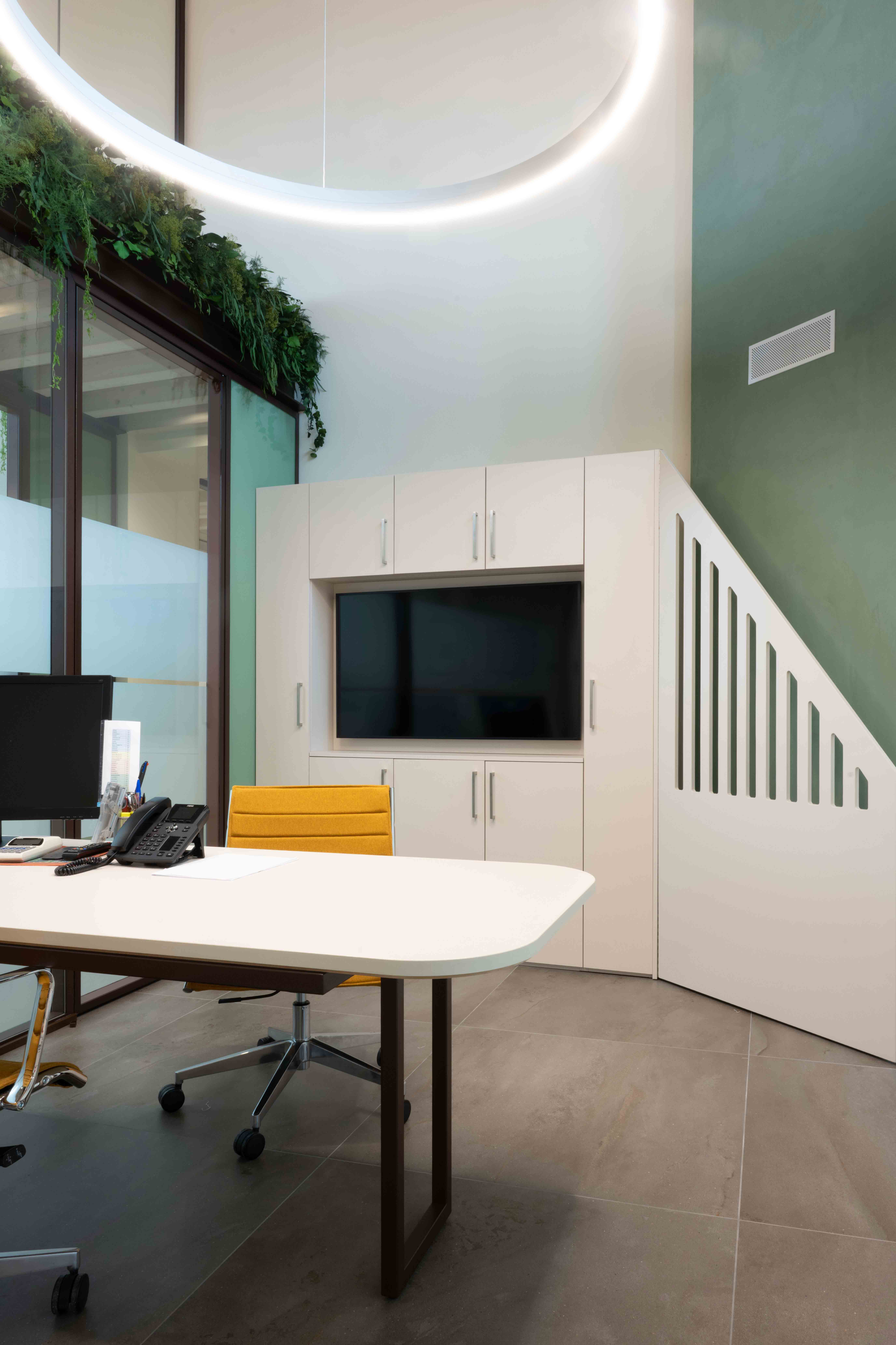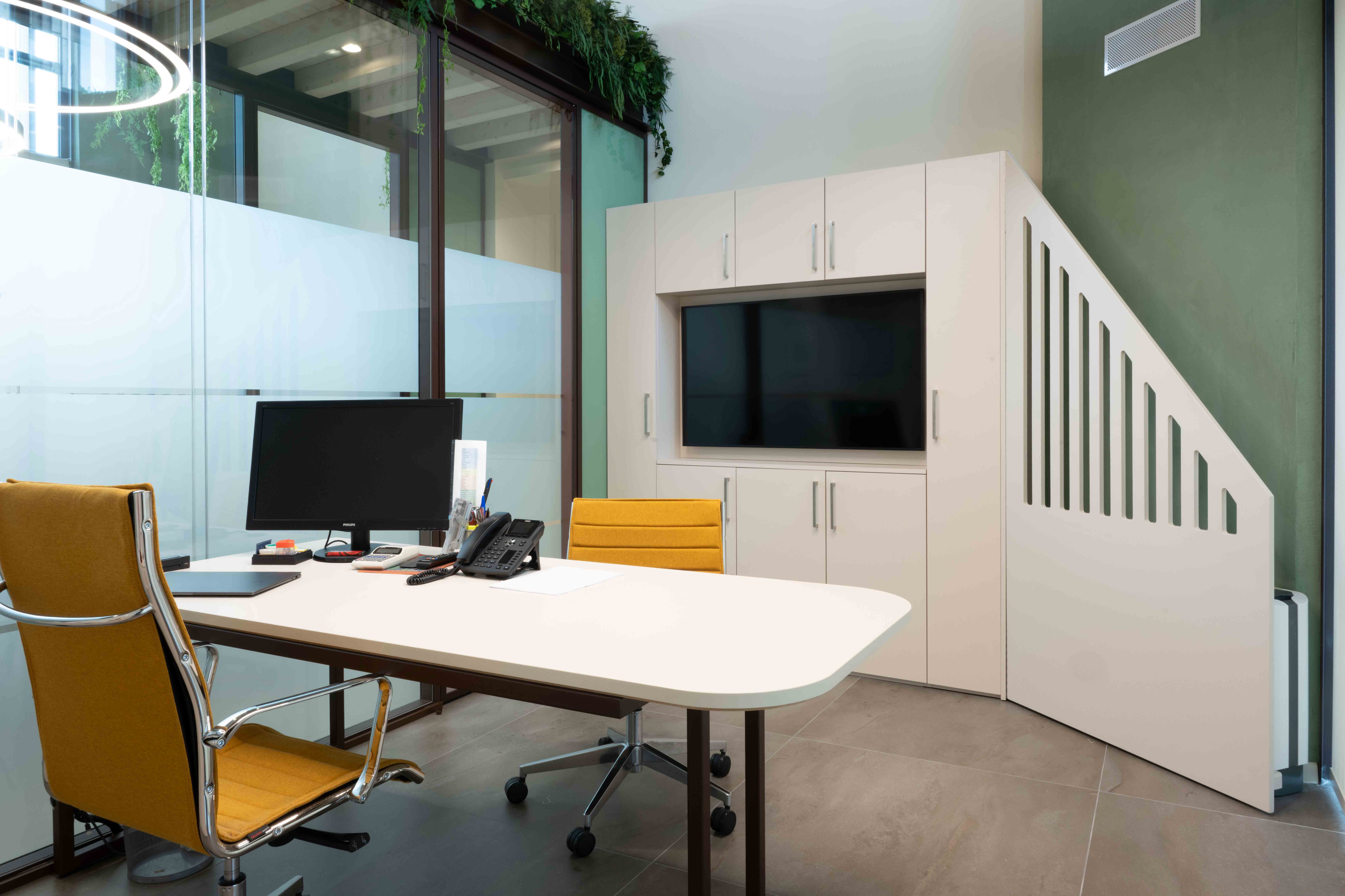 Un cascinale ristrutturato diventa sede di uffici dal carattere contemporaneo, dove luce e trasparenze dialogano con la struttura originaria. Le pareti vetrate, adattate ad misure inrregolari e con funzione insonorizzante, creano spazi riservati ma luminosi. Colori, materiali e arredi, scelti assieme all’architetto e al cliente, raccontano un equilibrio armonioso tra tradizione e modernità. Le armadiature su misura completano l’ambiente, fondendosi con l’architettura e valorizzandone l’indentità.