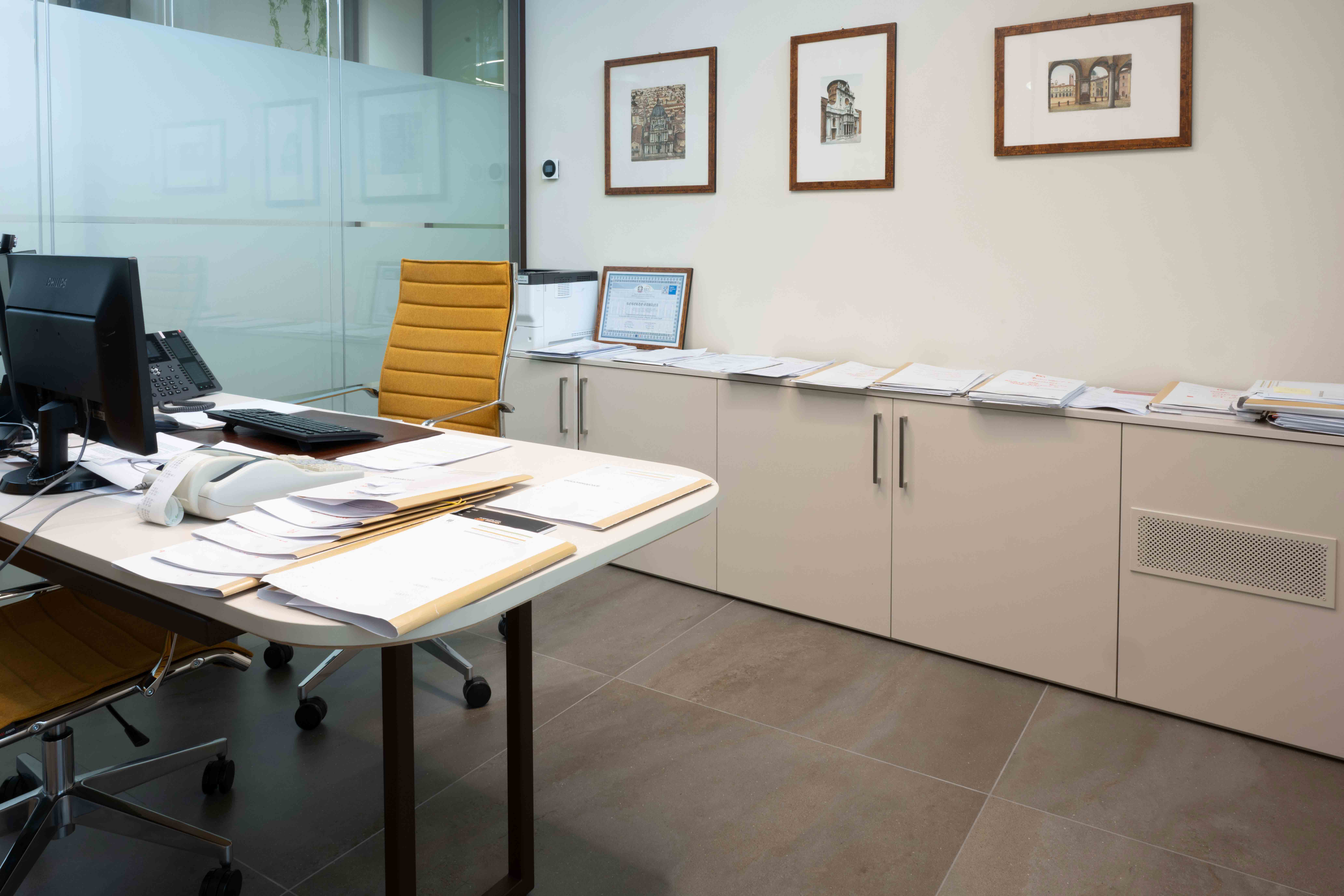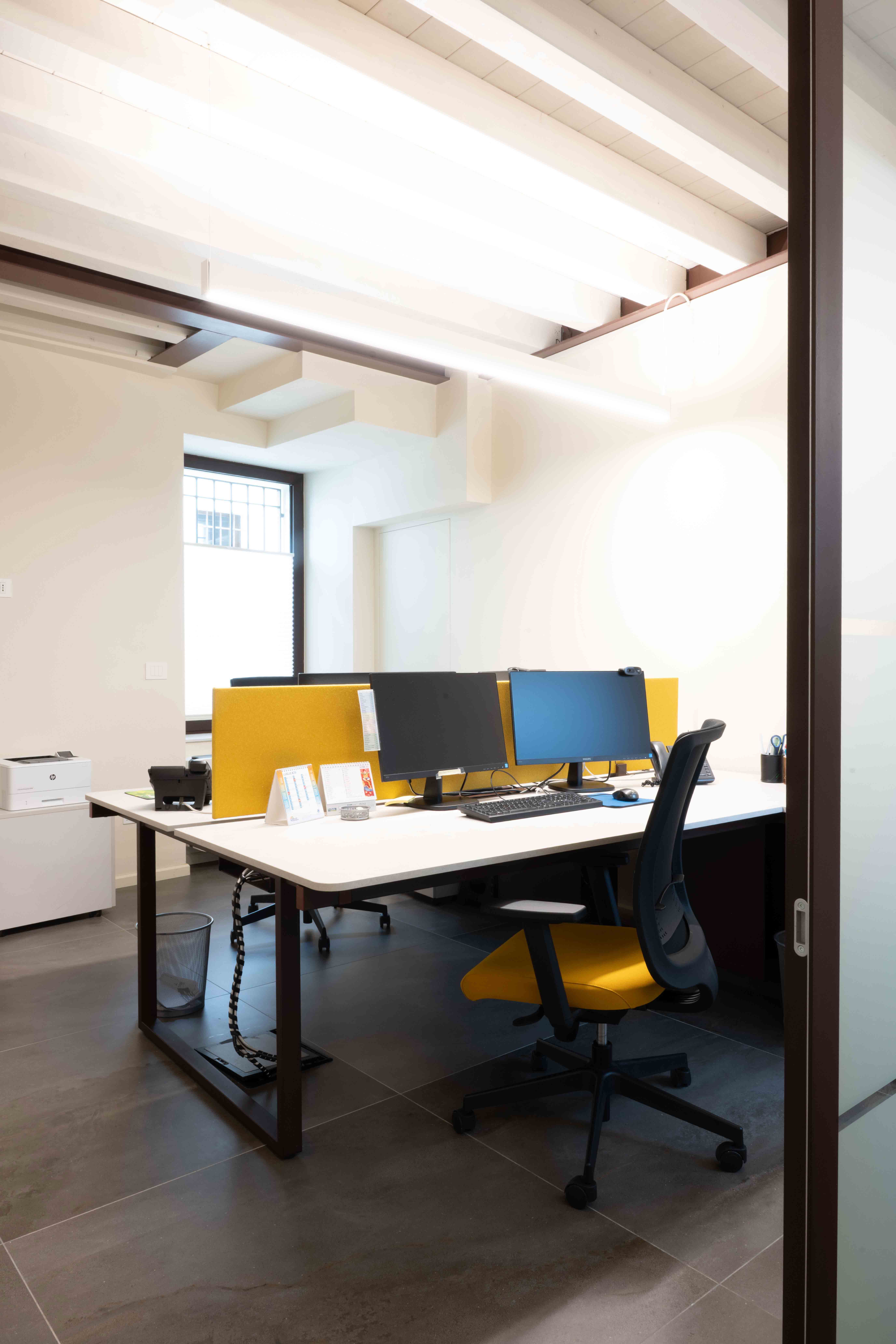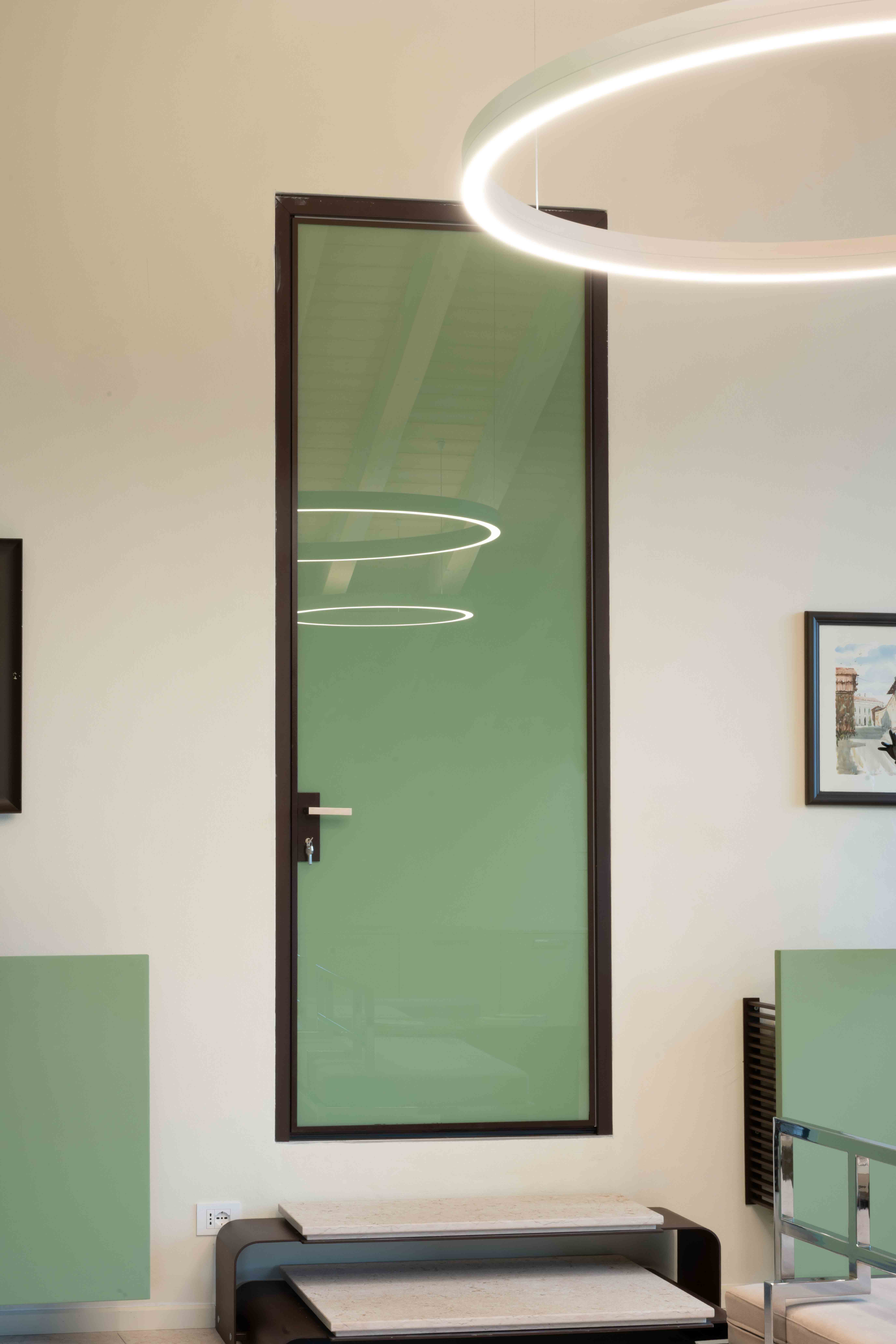 Un cascinale ristrutturato diventa sede di uffici dal carattere contemporaneo, dove luce e trasparenze dialogano con la struttura originaria. Le pareti vetrate, adattate ad misure inrregolari e con funzione insonorizzante, creano spazi riservati ma luminosi. Colori, materiali e arredi, scelti assieme all’architetto e al cliente, raccontano un equilibrio armonioso tra tradizione e modernità. Le armadiature su misura completano l’ambiente, fondendosi con l’architettura e valorizzandone l’indentità.